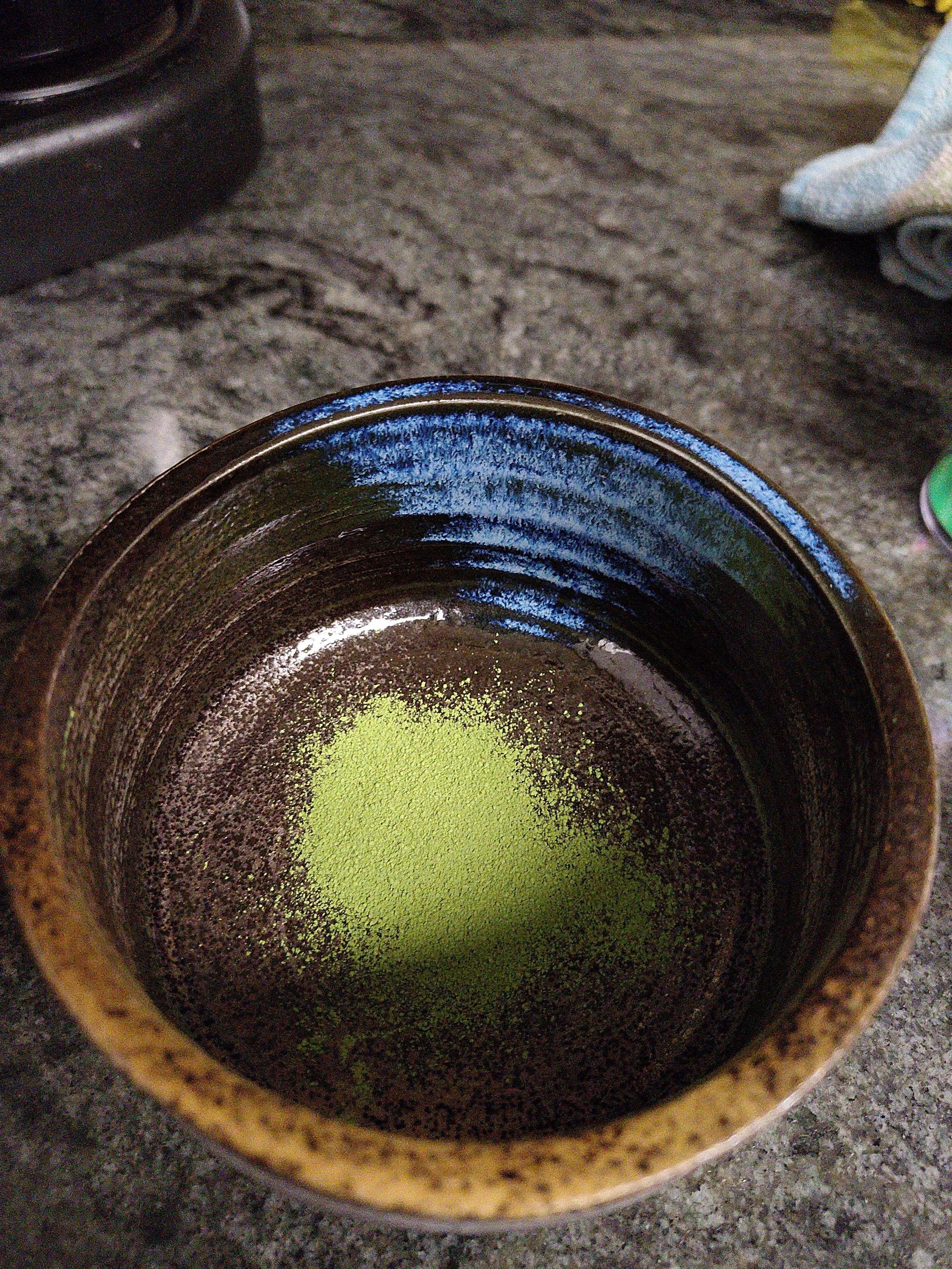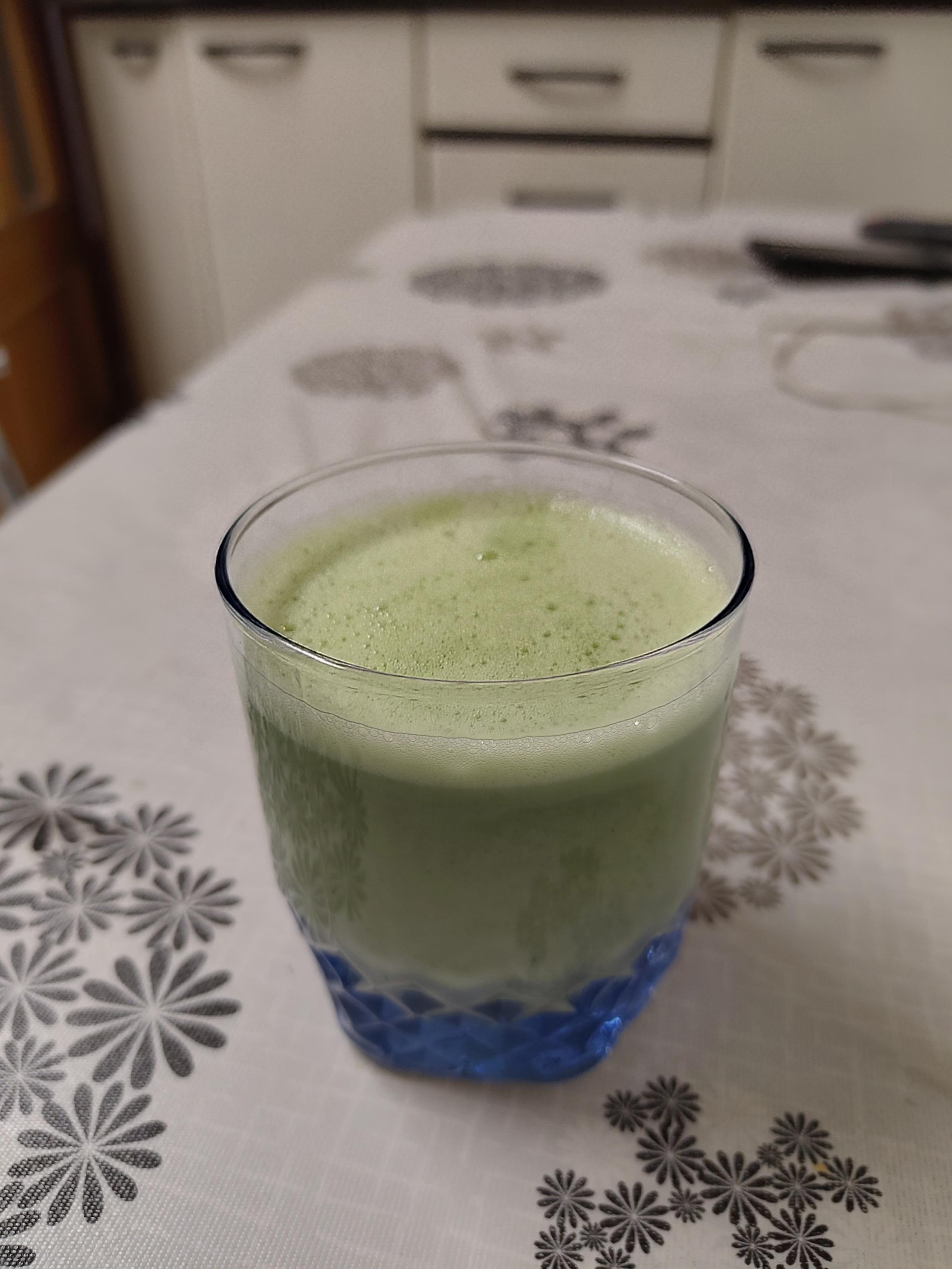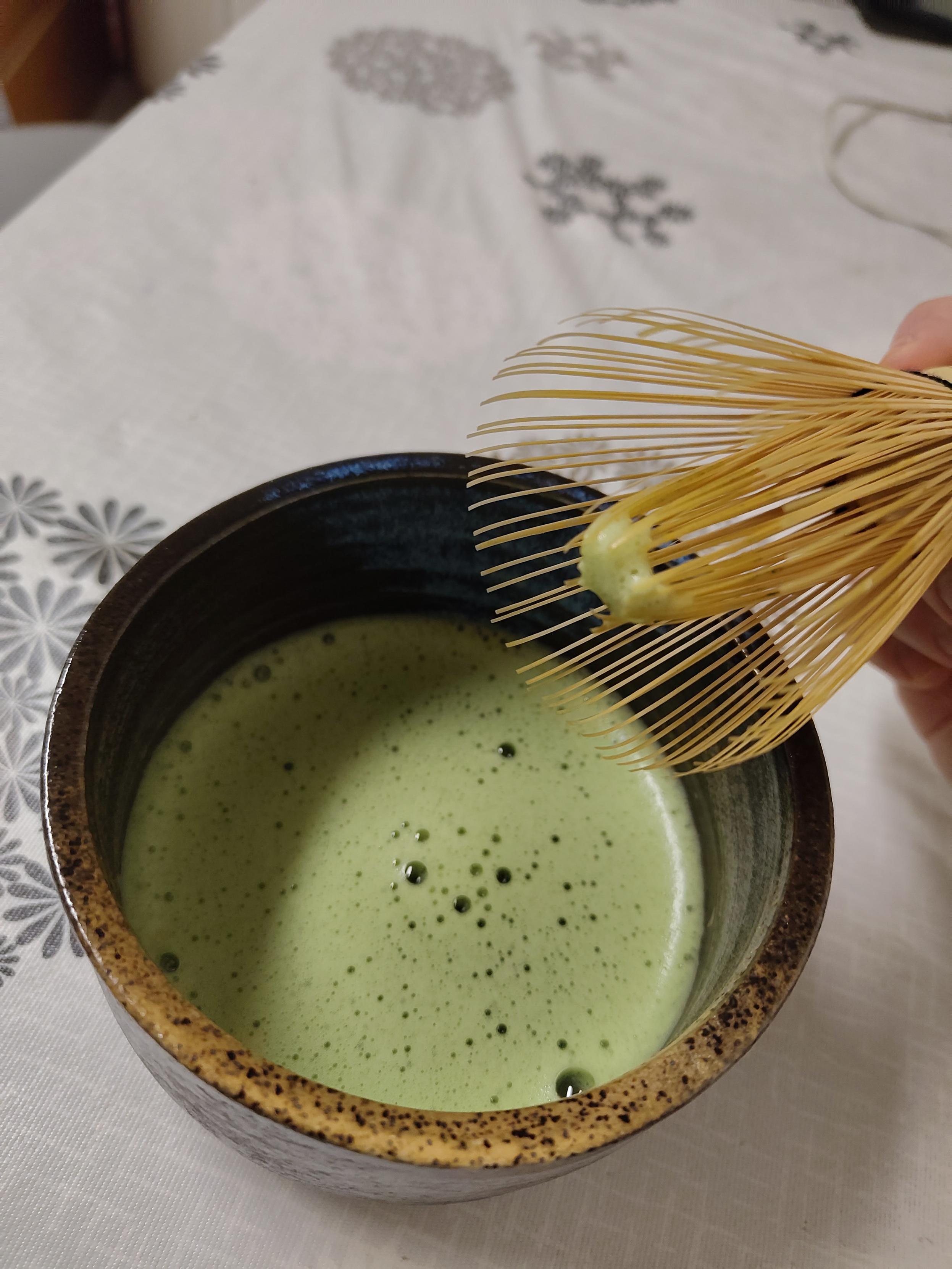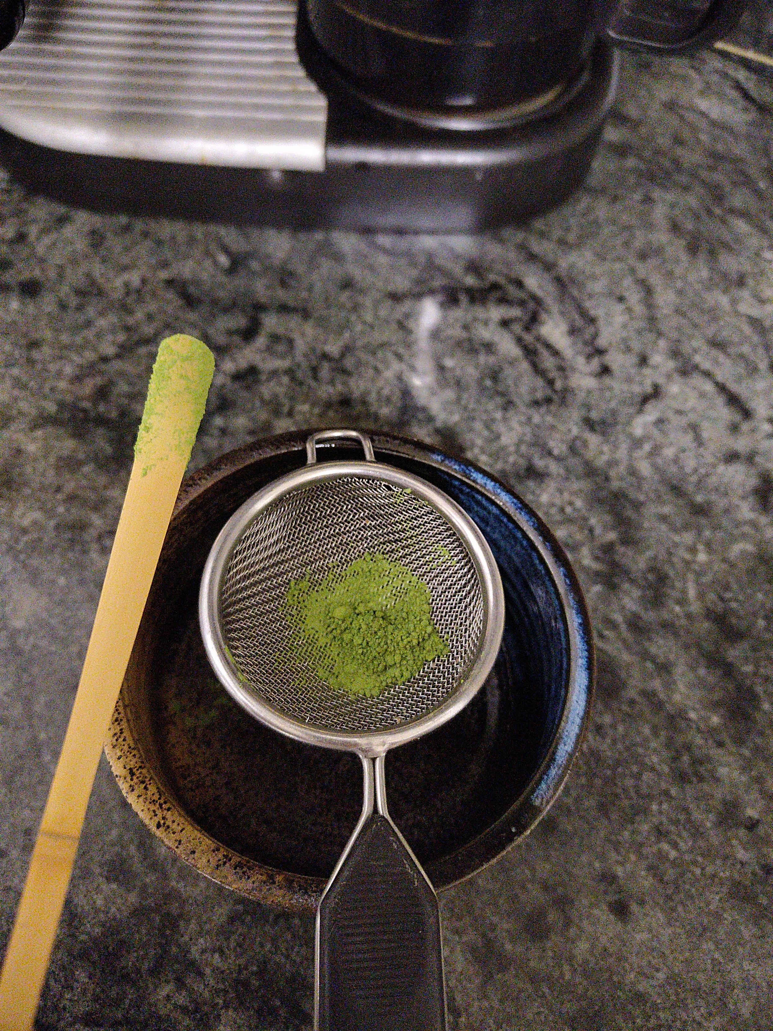Ur beroa bota eta nahastu. Hortxe gehitzen duen gauza bakarra da matcha bahe batetik pasatzeko