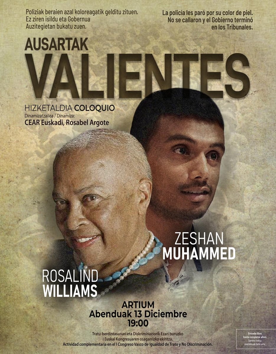 RT @GasteizIrekia@twitter.com: Hoy jueves 13, en el Artium a las 19h CEAR @CEAREuskadi@twitter.com nos da la oportunidad de conocer a Rosalind Williams, 1ª mujer que demandó al gobierno español xq un policía le pidió los papeles por ser negra. Litigó 18 años y hoy Naciones Unidas le ha dado la razón.