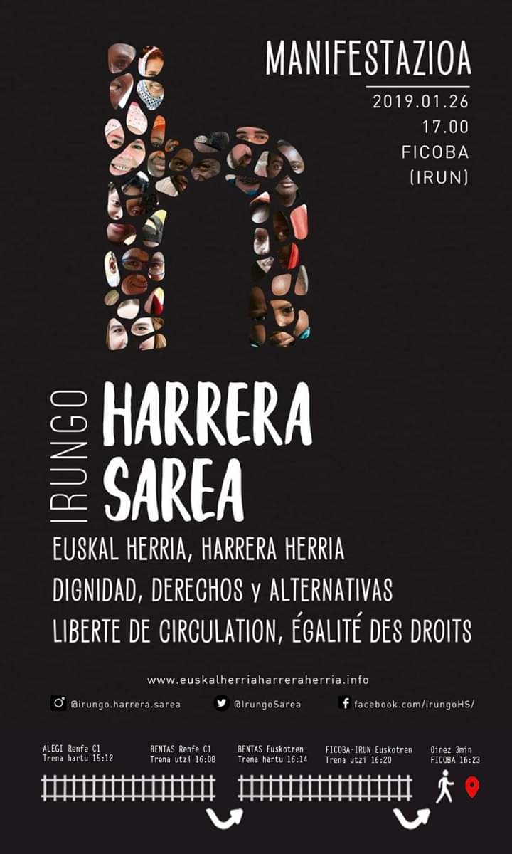 Irungo Harrera Sareak datorren larunbatean, urtarrilaren 26an, Irunen egingo den manifestaziora hurbiltzeko gonbitea luzatzen dizuegu.