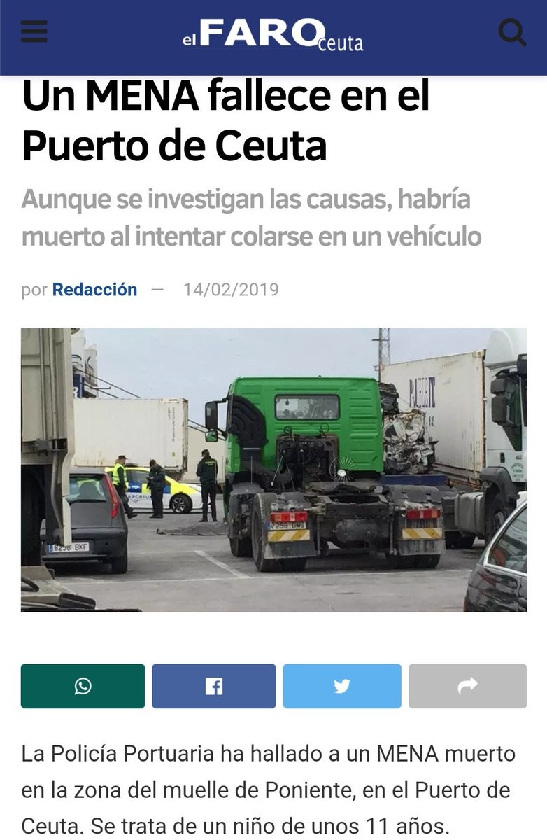 Dice el Faro de Ceuta que "un MENA ha fallecido en el Puerto de Ceuta", NO, no es un MENA, no es una "cosa", es un niño de 11 años que buscaba una vida mejor y ha sido asesinado por unas políticas racistas que impiden la libre circulación de las personas. https://elfarodeceuta.es/hallado-menor-muerto-puerto-ceuta/