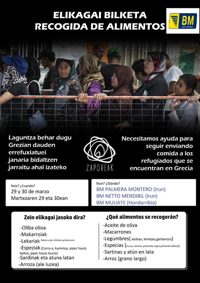 Martxoak 29/30 (9tatik-9tara) @ProyectoSabores@twitter.com Bidasoaldeko ,#BM merkatalguneetan, janari,#bilketa,#Lesbosera eramateko/#Recogida de alimentos en supermercados,#BM del Bidasoa para llevar a,#Lesbos, durante ,#29y30marzo (09.00-21h) @ProyectoSabores@twitter.com INF:https://www.gipuzkoasolidarioa.info/fevent/4842/pertsona-errefuxiatuen-aldeko-elikagai-bilketa-bidasoaldean/