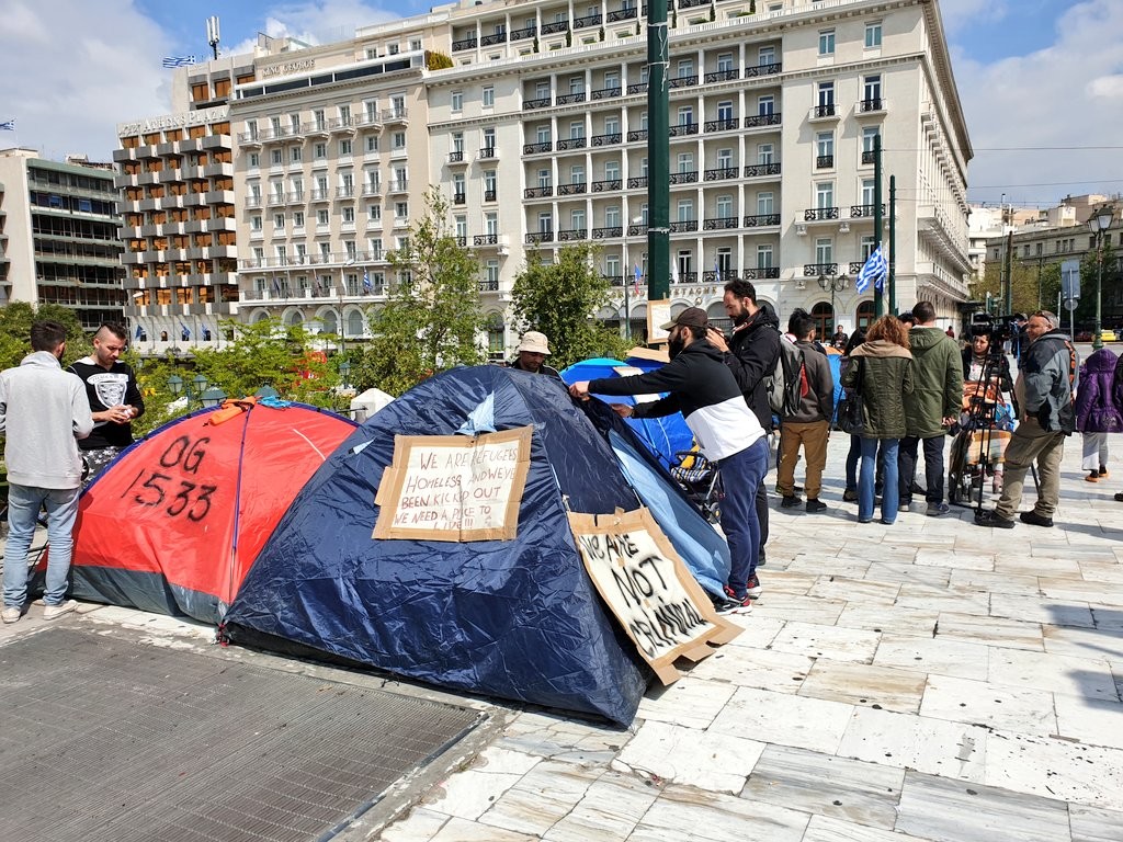60 refugiadas y refugiados desalojadas ayer de la okupa "Clandestino" han acampado en la plaza Syntagma para denunciar que no tienen ningún lugar donde vivir y tampoco pueden irse de Grecia legalmente.