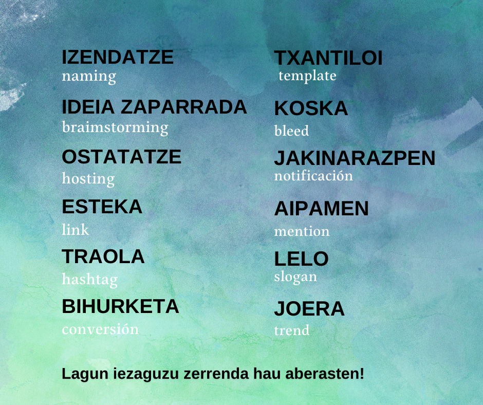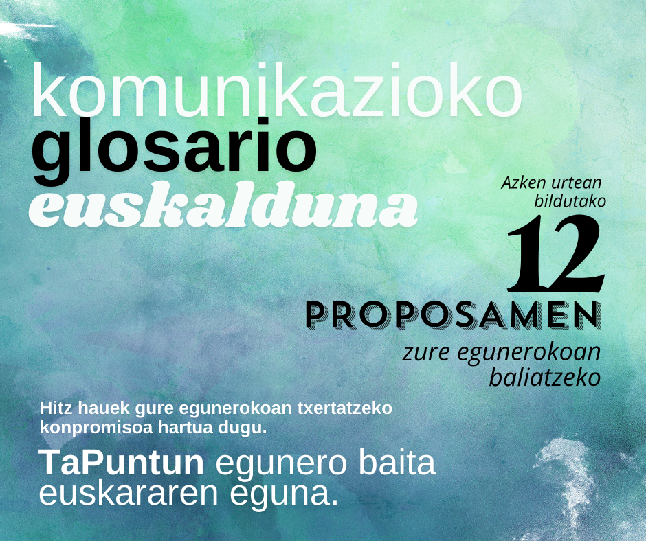 Gaur bezalako abenduaren 3 batean hartu genuen duela urtebete Komunikazioko glosario euskalduna osatzeko konpromisoa. Atzerriko maileguak utzi eta euskal izenak lehenesteko helburuz, hilabetez hilabete, gure ekarpen txikia egiten aritu gara, hamabi hitz osatu arte.