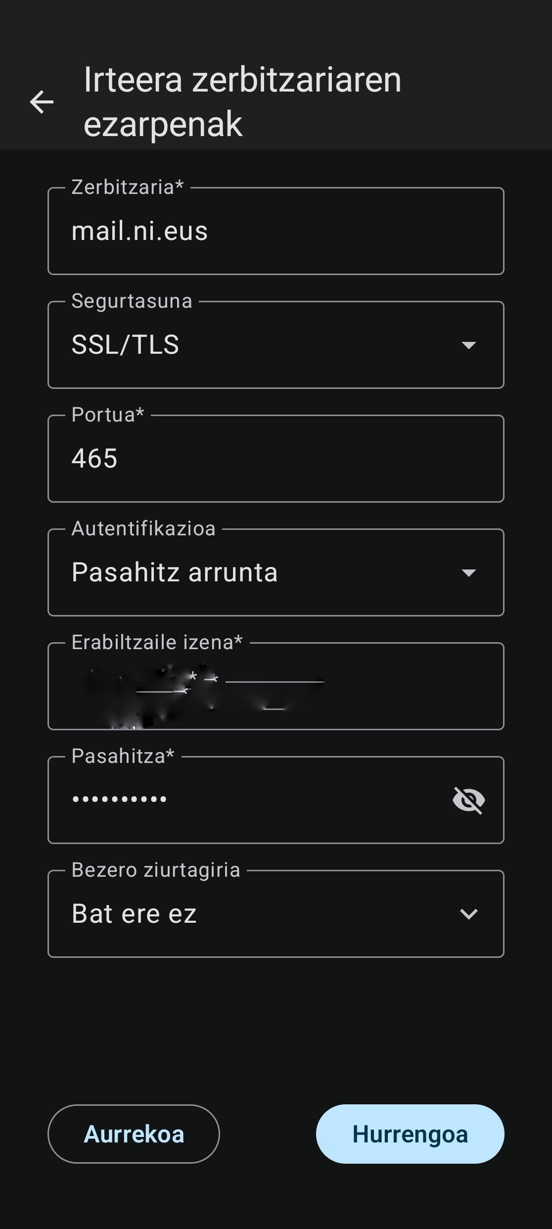 @gontxatorre lortu dut! Pasahitza ta portu ta zerbitzariak ondo jarri ta kitto. Eskerrik asko Gontxa! 👍🙏